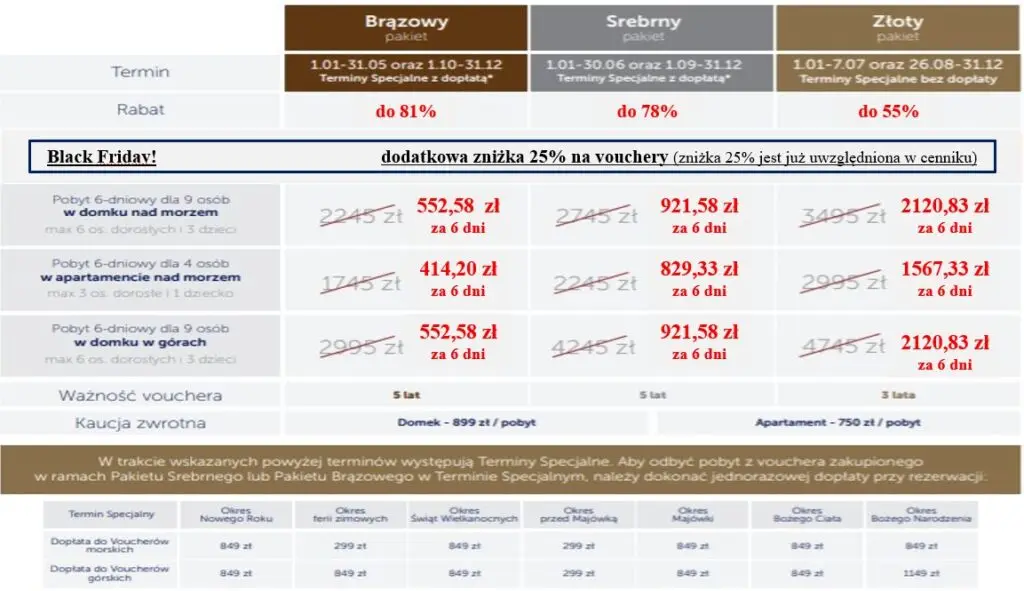 - SREBRO– termin realizacji vouchera od 1 stycznia do 30 czerwca oraz od 1 września do 31 grudnia Cennik domek (921,58 zł) Apartament (829,33 zł)