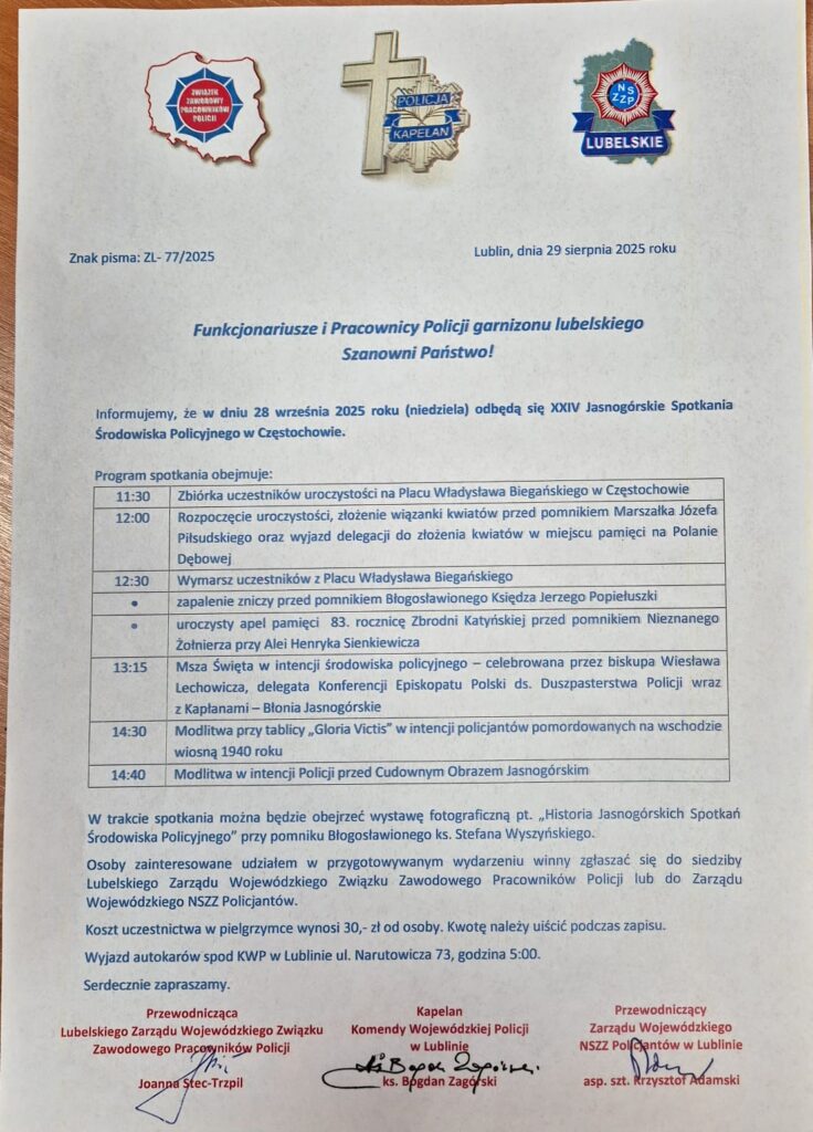 Zarząd Główny NSZZ Policjantów, od samego początku zaangażowany w organizację Jasnogórskich Spotkań, traktuje je jako przestrzeń, w której historia, pamięć i wspólnota spotykają się z teraźniejszością i troską o przyszłość. To właśnie na Jasnej Górze wielokrotnie umacnialiśmy się do dalszych działań na rzecz poprawy warunków służby, obrony praw funkcjonariuszy i budowania pozytywnego wizerunku Policji.