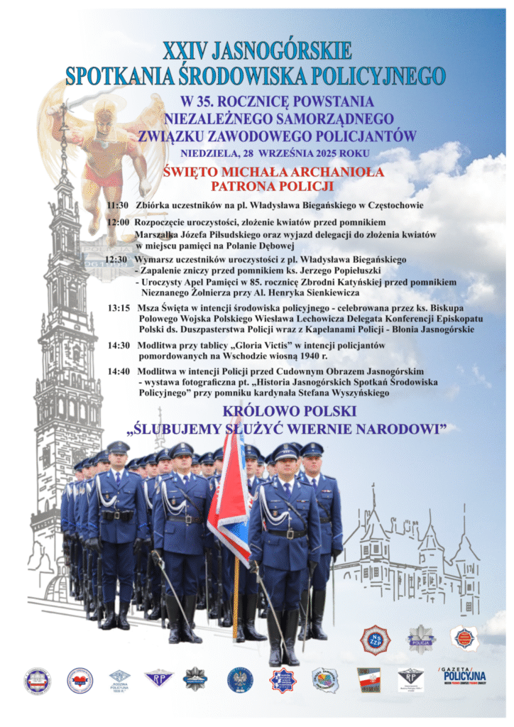 Święto św. Michała Archanioła, patrona polskiej Policji, od lat gromadzi na Jasnej Górze funkcjonariuszy, emerytów, rodziny i sympatyków formacji. Spotkanie rozpocznie się złożeniem kwiatów pod pomnikiem Marszałka Józefa Piłsudskiego oraz na Polanie Dębowej – miejscach szczególnie ważnych dla tradycji niepodległościowej i pamięci o tych, którzy służyli Ojczyźnie.